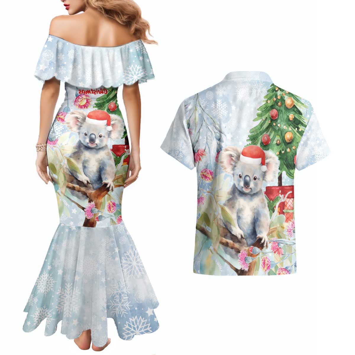 Australia Christmas Couples Matching Mermaid Dress and Hawaiian Shirt Koala Santa With Eucalyptus - Watercolor LT14