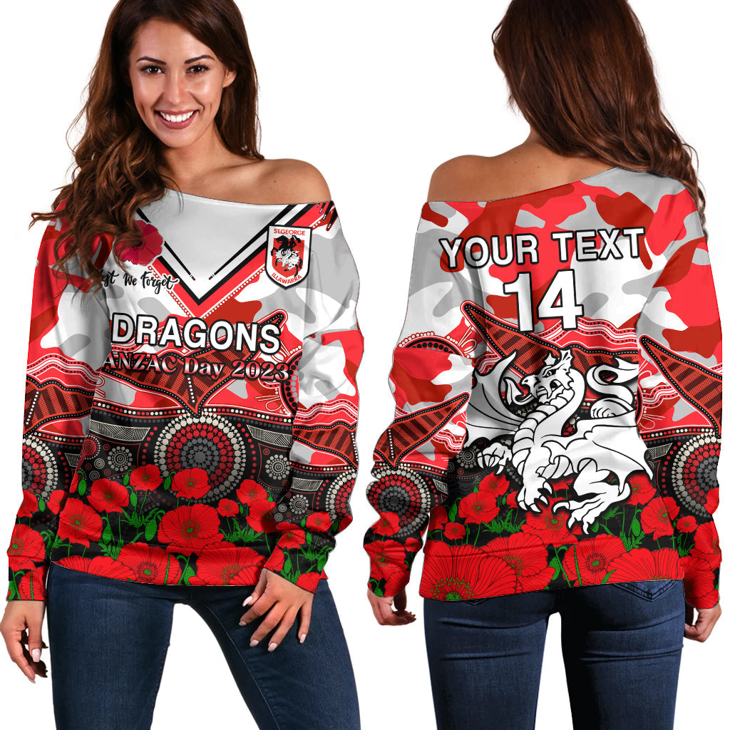 (Custom Text And Number) Dragons Rugby ANZAC 2023 Off Shoulder Sweater Aboriginal Mix Poppy Lest We Forget LT14