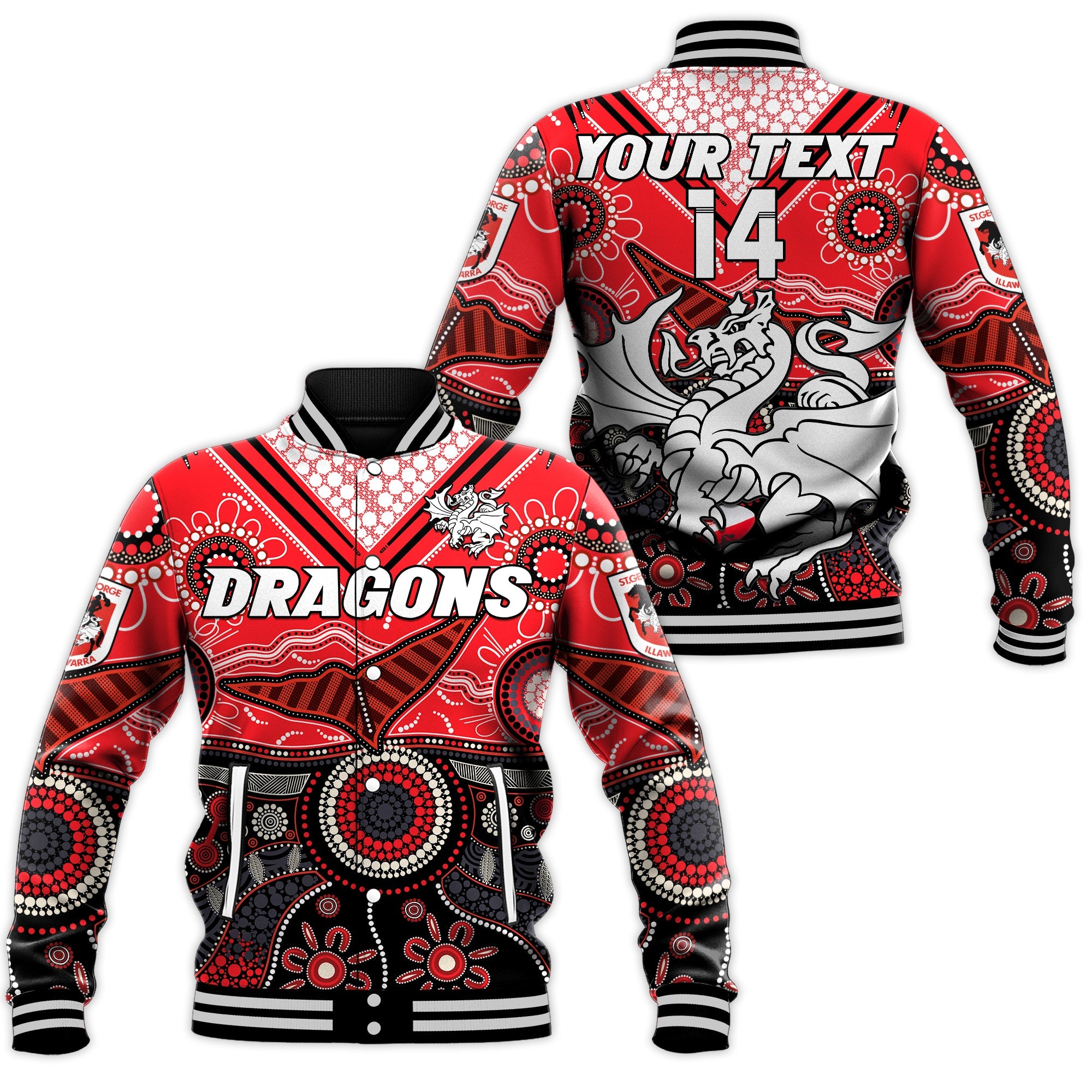 (Custom Text And Number) Dragons Rugby Baseball Jacket Indigenous Pattern Artsy Version LT14