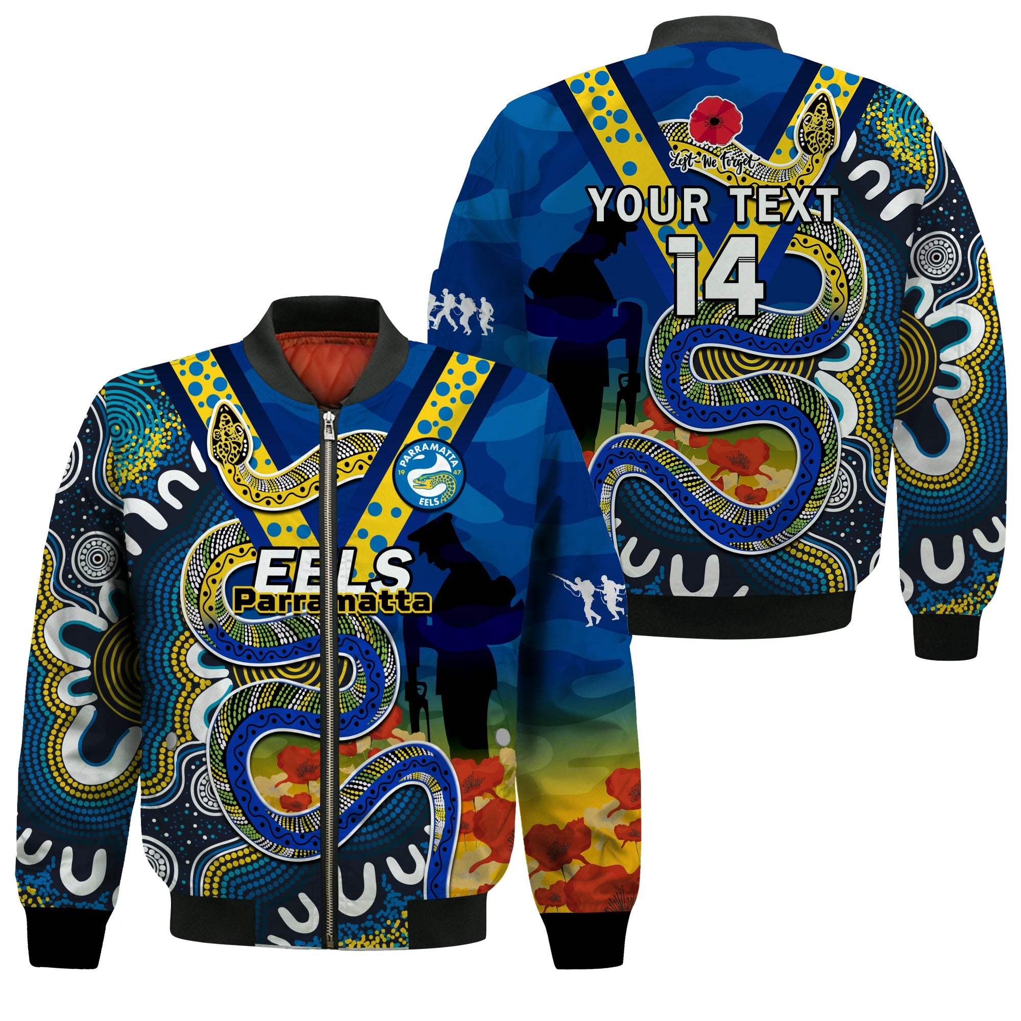 (Custom Text And Number) Eels Rugby ANZAC 2023 Bomber Jacket Aboriginal Mix Poppy Lest We Forget LT14
