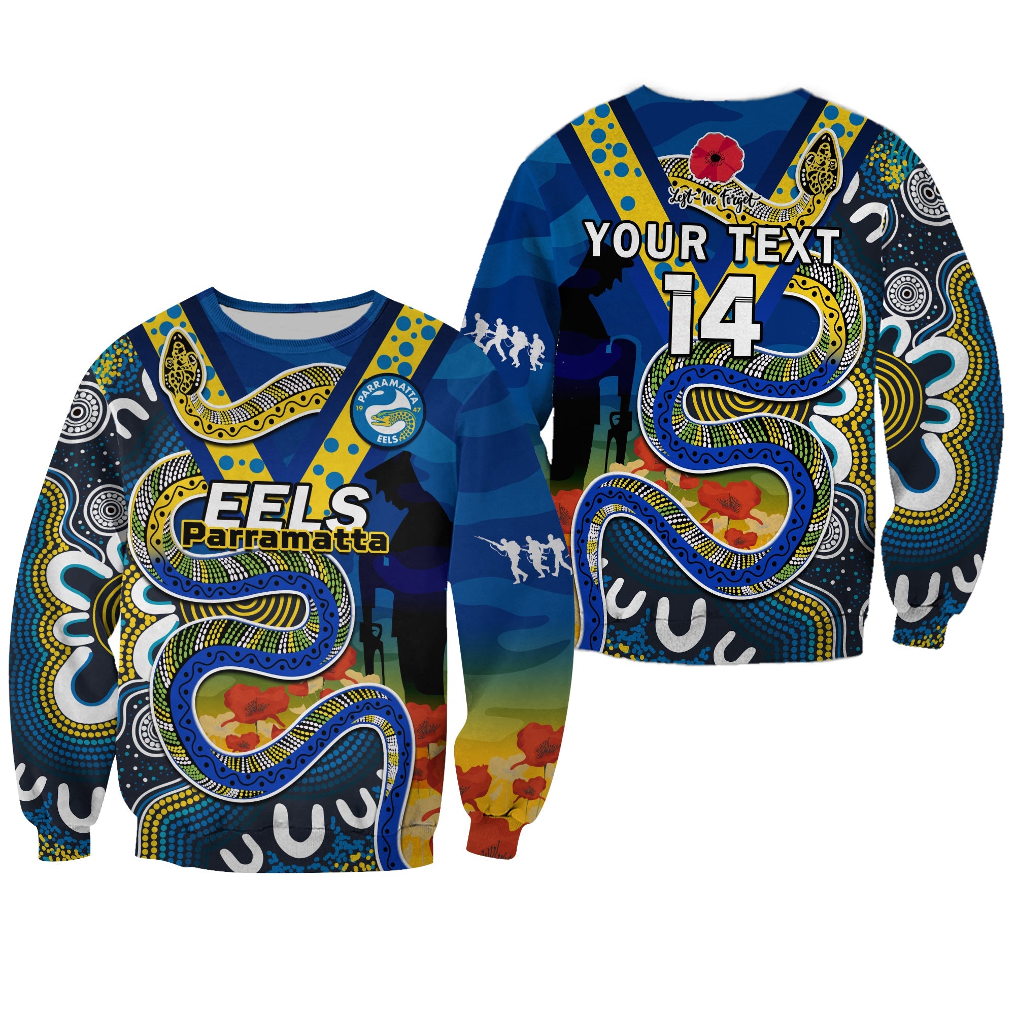 (Custom Text And Number) Eels Rugby ANZAC 2023 Sweatshirt Aboriginal Mix Poppy Lest We Forget LT14