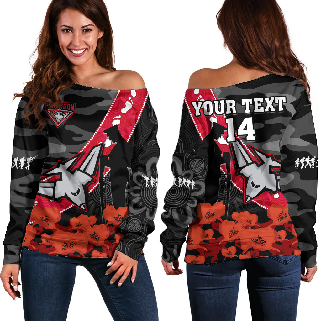 (Custom Text And Number) Essendon Football ANZAC 2023 Off Shoulder Sweater Bombers Aboriginal Mix Poppy Camouflage LT14