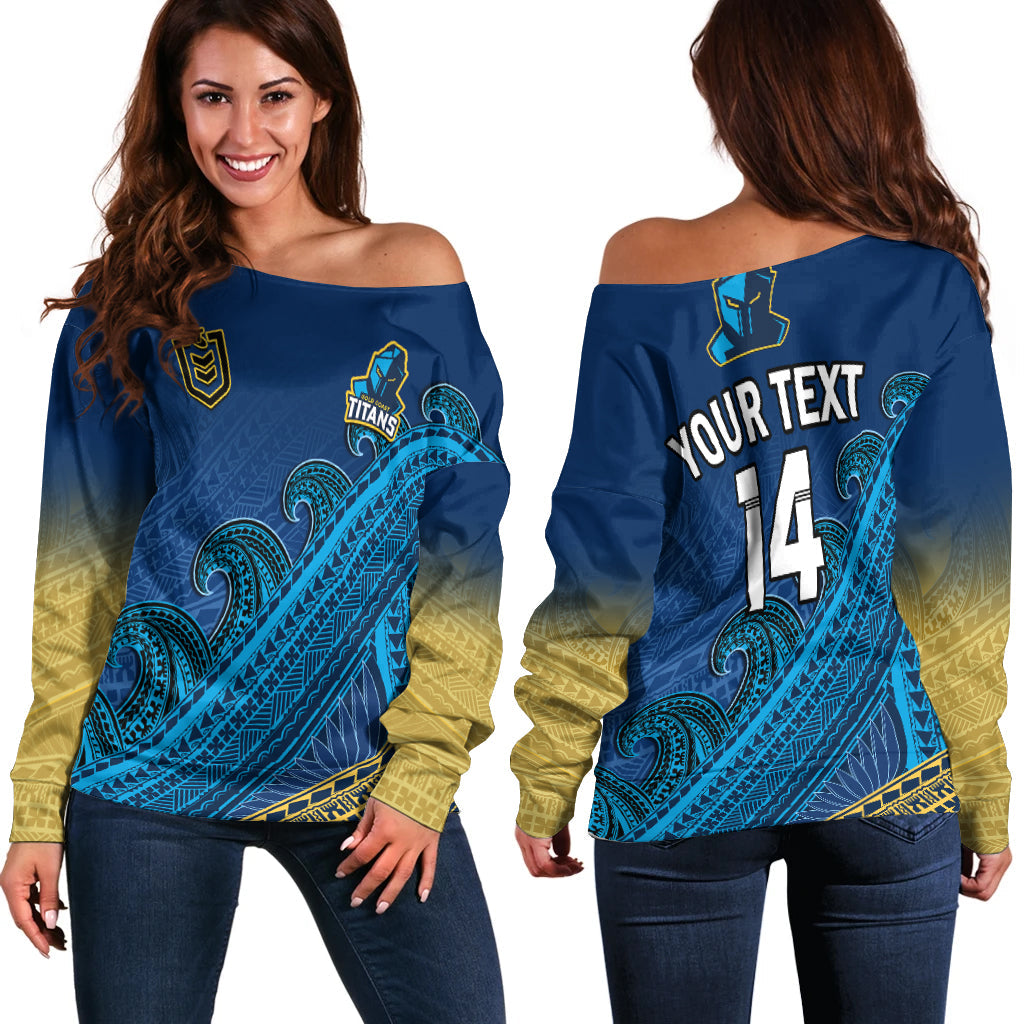 (Custom Text And Number) Gold Coast Titans Rugby Off Shoulder Sweater Pasifika Gradient Polynesian Pattern LT14
