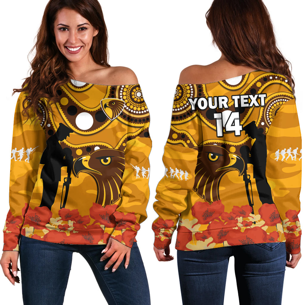 (Custom Text And Number) Hawks Football ANZAC 2023 Off Shoulder Sweater Indigenous Mix Poppy Camouflage LT14