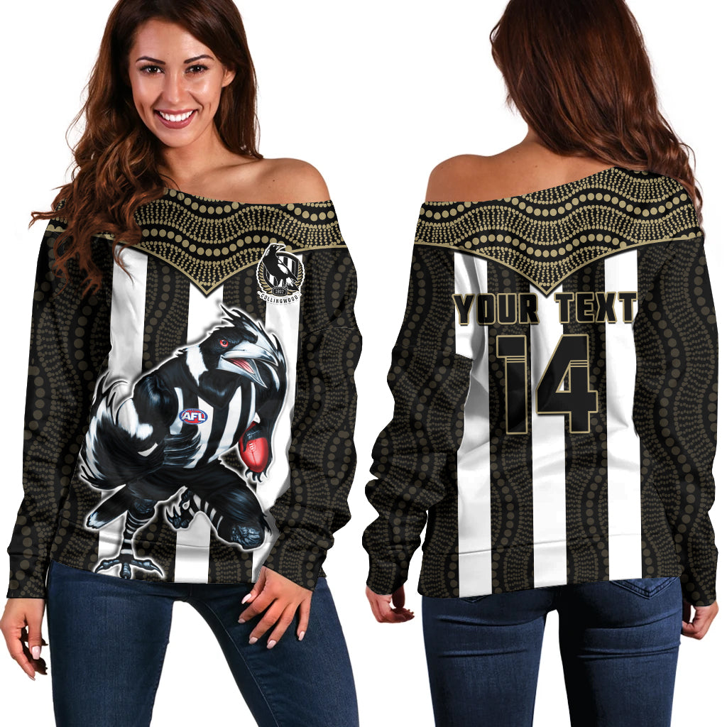 (Custom Text And Number) Magpies Football Off Shoulder Sweater Collingwood 1892 Indigenous Sporty Style LT14
