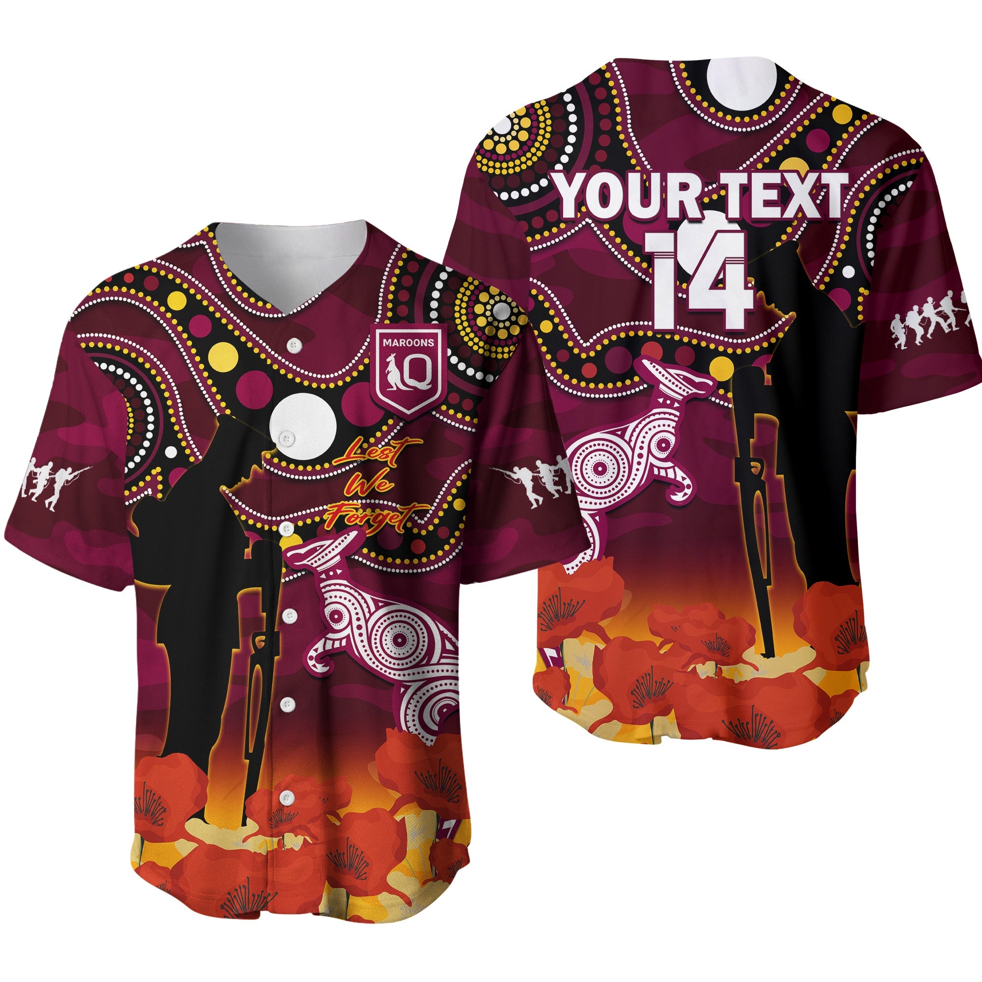 (Custom Text And Number) Maroons Rugby ANZAC 2023 Baseball Jersey QLD Aboriginal Mix Poppy Camouflage Ver.01 LT14