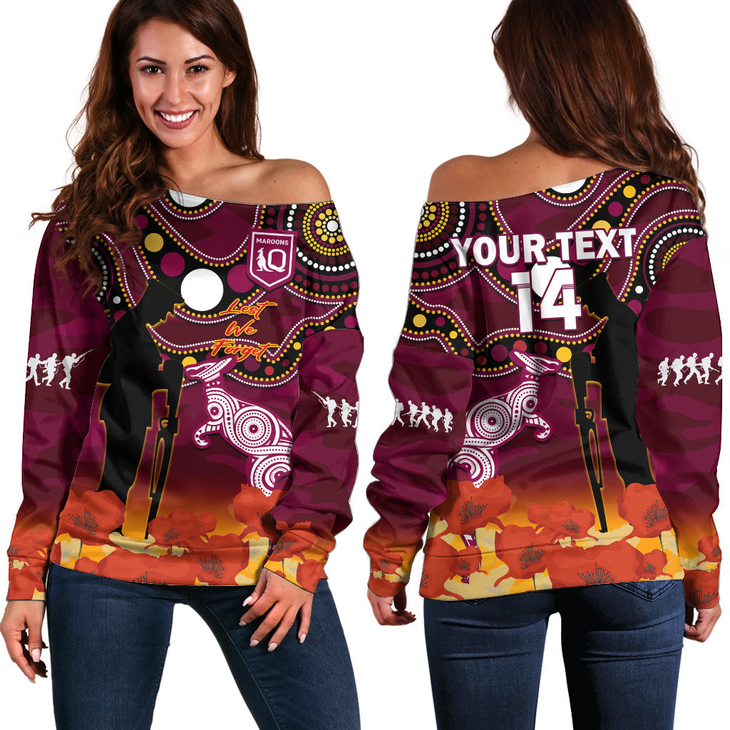 (Custom Text And Number) Maroons Rugby ANZAC 2023 Off Shoulder Sweater QLD Aboriginal Mix Poppy Camouflage LT14