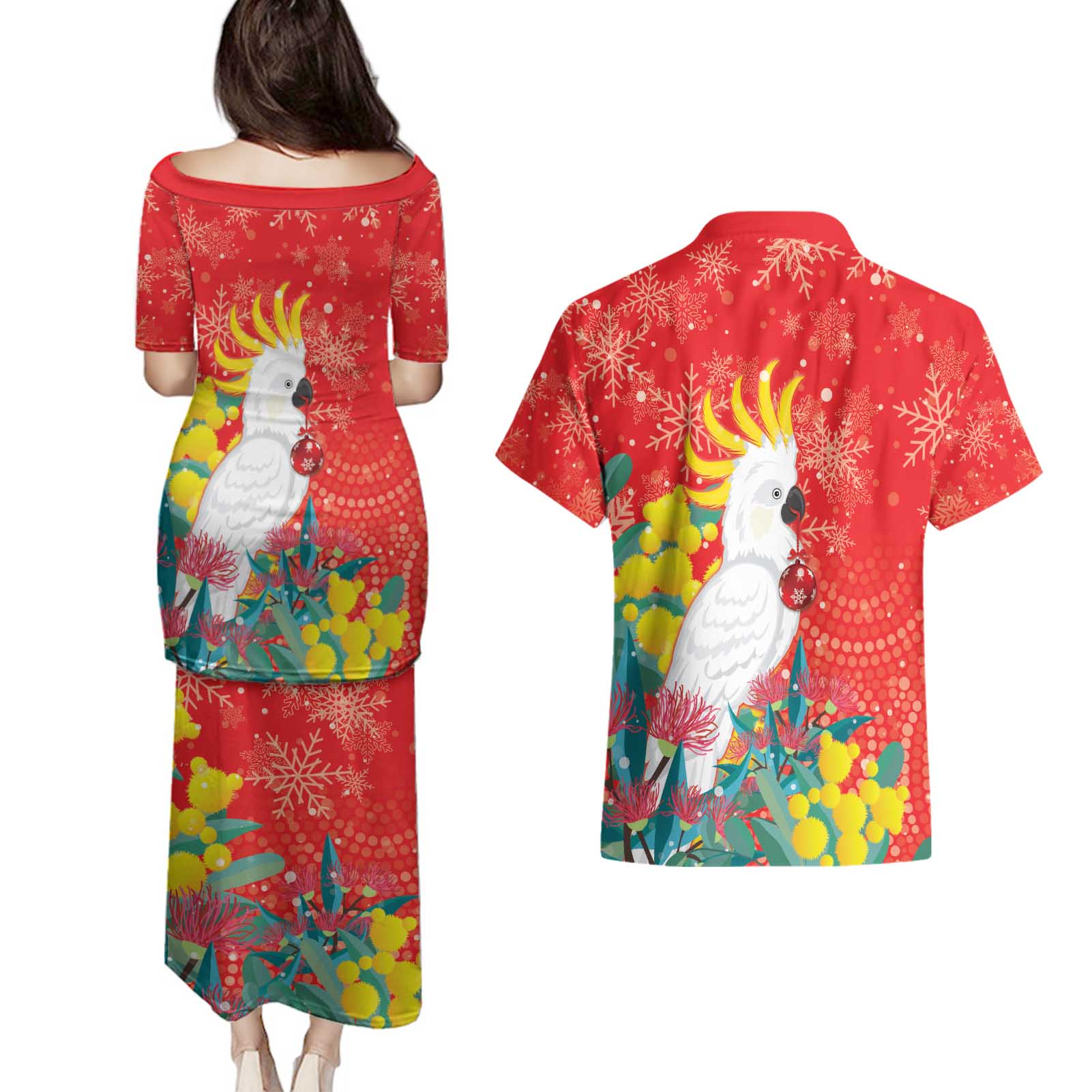 Sulphur-crested Cockatoo Christmas Couples Matching Puletasi and Hawaiian Shirt Australia Gumtree With Golden Wattle LT14